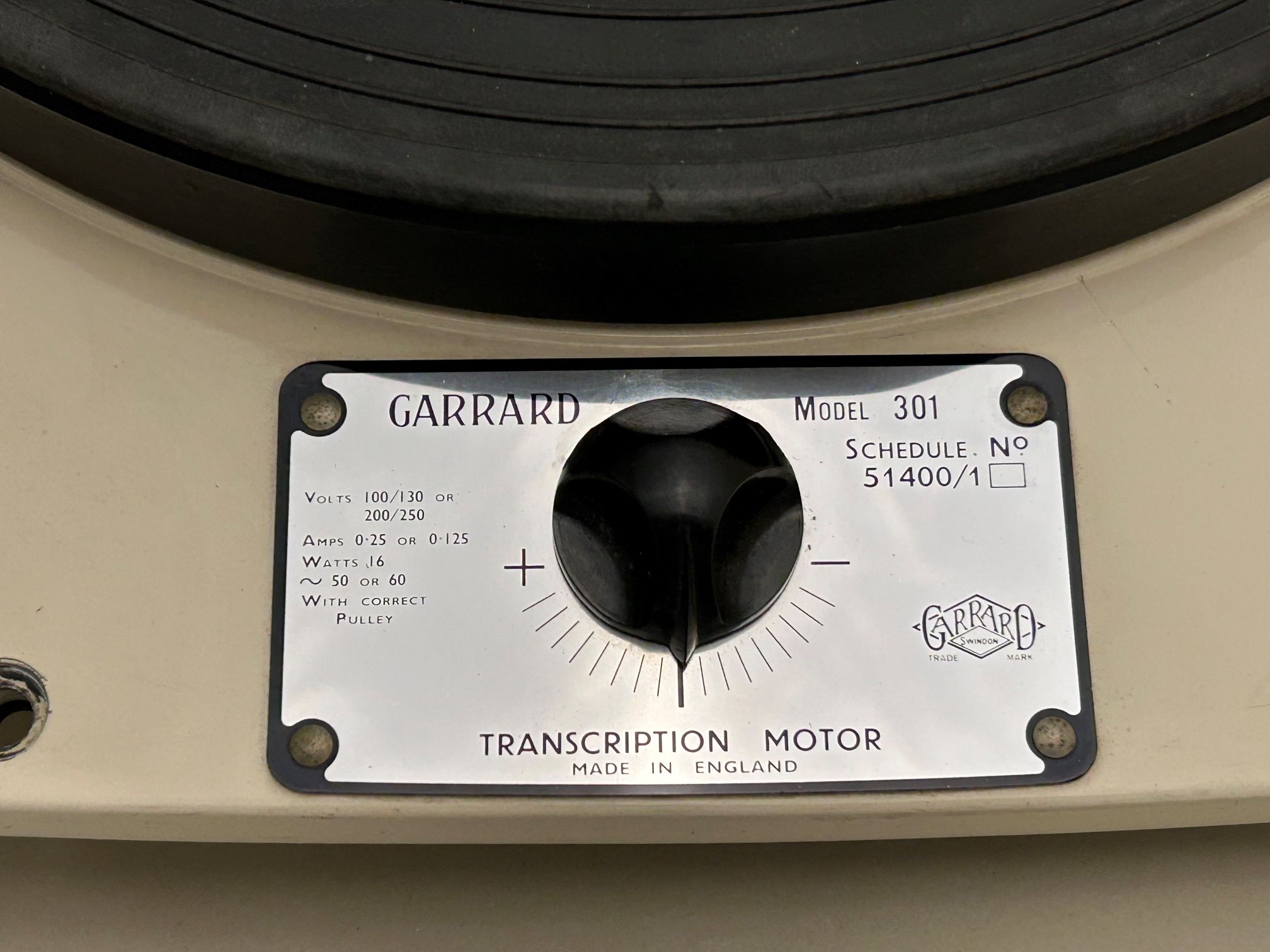 Early Garrard 301 grease bearing transcription turntableAn early ivory-coloured schedule 1 Garrard 301 turntable, with silver fascia plates and a grease-bearing. It is in working order, but due to its age would probably benefit from a service. There is a dustbug mark on the left-hand side, and several small marks / scratches on the enamel. Mounting bolts are included. This item is for collection only, from Sussex. Sorry we are not able to post this item. Contact: info@audiojumble.co.uk Click here for more photos |